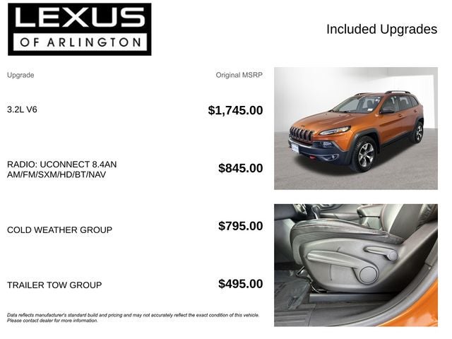 With Some Available Options Like Cold Weather Group (Engine Block Heater, Exterior Mirrors w/Heating Element, Heated Front Seats, Heated Steering Wheel, Jeep Rack Off Road Accessory Kit, Power Heated Mirrors, and Windshield Wiper De-Icer), Quick Order Package 27E, Trailer Tow Group (7 & 4 Pin Wiring Harness, Auxiliary Transmission Oil Cooler, Class III Receiver Hitch, and Trailer Tow Wiring Harness), 1 Year Trial (Registration Required), 17 x 7.5 Aluminum Wheels, 4-Wheel Disc Brakes, 5-Year SiriusXM Traffic Service, 5-Year SiriusXM Travel Link Service, 6 Speakers, 8.4 Touch Screen Display, ABS brakes, Accent Color Exterior Mirrors, Air Conditioning, Alloy wheels, AM/FM radio: SiriusXM, Anti-whiplash front head restraints, Brake assist, Cloth/Leather/Vinyl Bucket Seats, Compass, Delay-off headlights, Driver door bin, Driver vanity mirror, Dual front impact airbags, Dual front side impact airbags, Electronic Stability Control, Emergency communication system, Engine Oil Cooler, Four wheel independent suspension, Front anti-roll bar, Front Bucket Seats, Front Center Armrest, Front fog lights, Front reading lights, Fully automatic headlights, GPS Antenna Input, GPS Navigation, Harman Radio Manufacturer, HD Radio, Illuminated entry, Integrated Voice Command w/Bluetooth®, Knee airbag, Leather Shift Knob, Low tire pressure warning, No Satellite Coverage w/AK/HI, Occupant sensing airbag, Off Road Suspension, Outside temperature display, Overhead airbag, Overhead console, Panic alarm, ParkView Rear Back-Up Camera, Passenger door bin, Passenger vanity mirror, Power door mirrors, Power steering, Power windows, Radio data system, Radio: Uconnect 8.4A AM/FM/SXM/BT, Radio: Uconnect 8.4AN AM/FM/SXM/HD/BT/NAV, Rear anti-roll bar, Rear reading lights, Rear seat center armrest, Rear side impact airbag, Rear window defroster, Rear window wiper, Remote keyless entry, Roof rack: rails only, SIRIUSXM Satellite Radio, SIRIUSXM Traffic, SiriusXM Travel Link, Speed control, Speed-sensing steering, Split folding rear seat, Spoiler, Steering wheel mounted audio controls, Tachometer, Telescoping steering wheel, Tilt steering wheel, Traction control, Trip computer, Uconnect Access, Variably intermittent wipers, and Voltmeter.