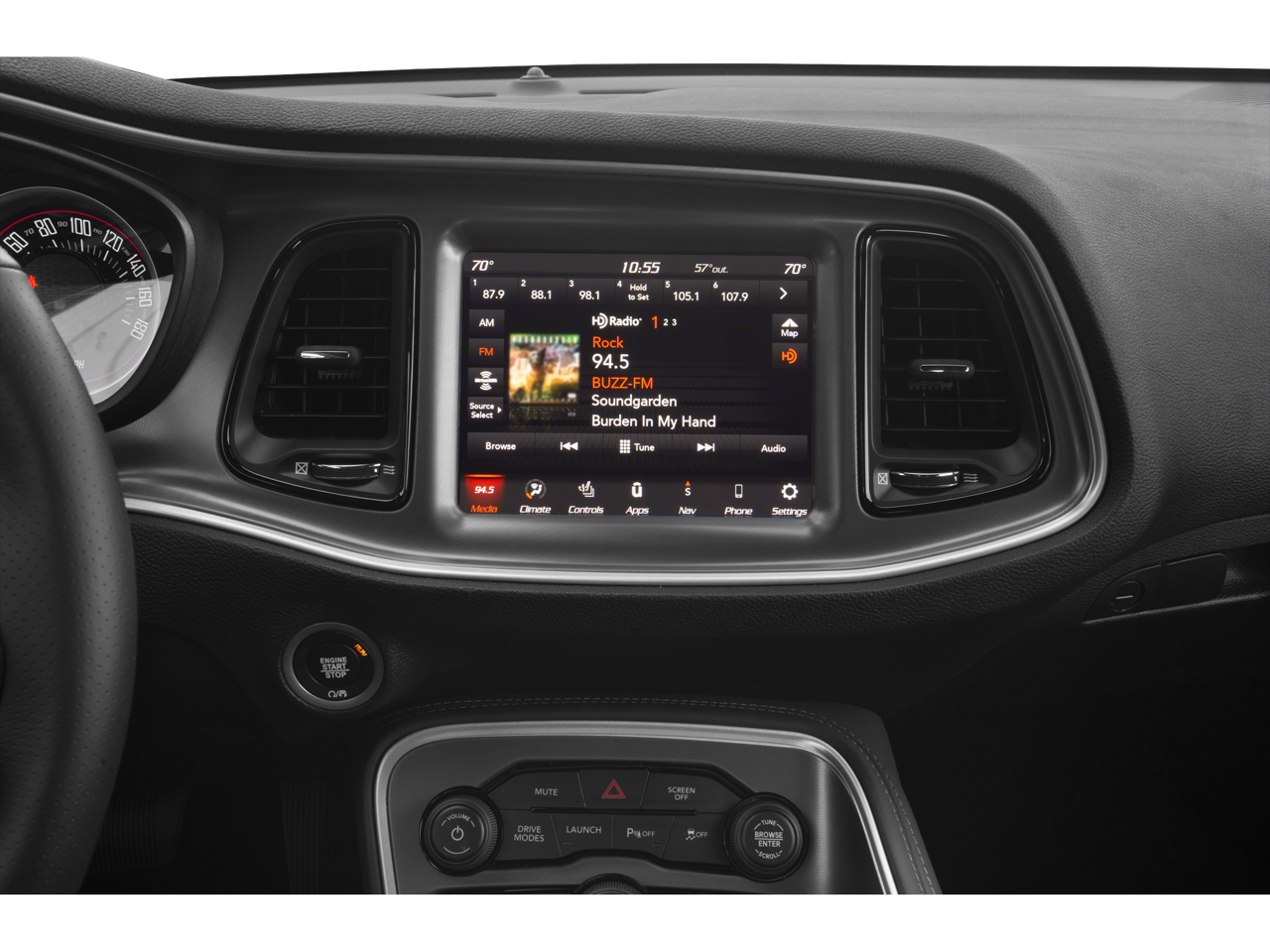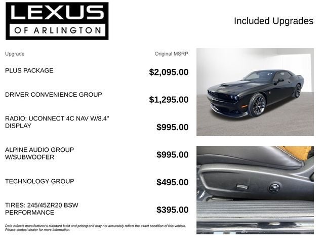 With Some Available Options Like Alpine Audio Group w/Subwoofer (506 Watt Amplifier, 9 Amplified Speakers w/Subwoofer, and Surround Sound), Driver Convenience Group (Blind Spot & Cross Path Detection, High-Intensity Discharge Headlamps, and Power Multi-Function Foldaway Mirrors), Plus Package (Door Trim Panel w/Ambient Lighting, Heated Steering Wheel, Power Tilt/Telescope Steering Column, Premium-Stitched Dash Panel, and Radio/Driver Seat/Mirrors Memory), Quick Order Package 23G R/T Scat Pack, Technology Group (Auto High Beam Headlamp Control and Rain Sensitive Windshield Wipers), 1-Yr SiriusXM Guardian Trial, 230MM Rear Axle, 4-Wheel Disc Brakes, 4G LTE Wi-Fi Hot Spot, 5-Year SiriusXM Traffic Service, 5-Year SiriusXM Travel Link Service, 6 Speakers, 8.4 Touchscreen Display, ABS brakes, Air Conditioning, Alloy wheels, AM/FM radio: SiriusXM, Anti-whiplash front head restraints, Apple CarPlay, Apple CarPlay/Android Auto, Auto-dimming Rear-View mirror, Automatic temperature control, Brake assist, Bumpers: body-color, Compass, Delay-off headlights, Driver door bin, Driver vanity mirror, Dual front impact airbags, Dual front side impact airbags, Electronic Stability Control, Emergency communication system: SiriusXM Guardian, For Details, Visit DriveUconnect.com, Four wheel independent suspension, Front anti-roll bar, Front Bucket Seats, Front Center Armrest, Front dual zone A/C, Front fog lights, Front License Plate Bracket, Front reading lights, Fully automatic headlights, Garage door transmitter, Google Android Auto, GPS Antenna Input, GPS Navigation, HD Radio, Heated door mirrors, Heated front seats, Heated steering wheel, Illuminated entry, Integrated Center Stack Radio, Integrated Voice Command w/Bluetooth®, Leather Shift Knob, Low tire pressure warning, Media Hub (2 USB, AUX), Outside temperature display, Overhead airbag, Overhead console, Panic alarm, ParkView Rear Back-Up Camera, Passenger door bin, Passenger vanity mirror, Power door mirrors, Power driver seat, Power steering, Power windows, Radio data system, Radio: Uconnect 4C Nav w/8.4 Display, Radio: Uconnect 4C w/8.4 Display, Rear anti-roll bar, Rear reading lights, Rear seat center armrest, Rear window defroster, Remote keyless entry, Scat Pack Logo Houndstooth Seat, Security system, Shark Fin Antenna, SiriusXM Satellite Radio, SiriusXM Traffic Plus, SiriusXM Travel Link, Speed control, Speed-sensing steering, Split folding rear seat, Spoiler, Sport steering wheel, Steering wheel mounted audio controls, Tachometer, Telescoping steering wheel, Tilt steering wheel, Traction control, Trip computer, USB Host Flip, Variably intermittent wipers, and Wheels: 20 x 9 Lo Gloss Granite CrystaL.