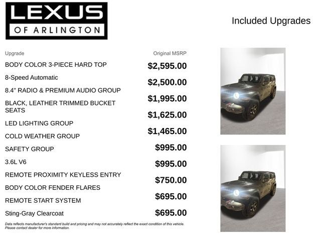 With Some Available Options Like 8.4 Radio & Premium Audio Group (1-Year SiriusXM Guardian Trial, 4G LTE Wi-Fi Hot Spot, 5-Year SiriusXM Traffic Service, 5-Year SiriusXM Travel Link Service, 8.4 Touchscreen Display, Alpine Premium Audio System, Auto-Dimming Rear-View Mirror, Emergency/Assistance Call, For Details, Visit DriveUconnect.com, GPS Navigation, HD Radio, Off-Road Info Pages, Radio: Uconnect 4C Nav w/8.4 Display, SiriusXM Traffic Plus, and SiriusXM Travel Link), Cold Weather Group (Heated Front Seats and Heated Steering Wheel), LED Lighting Group (Daytime Running Lamps LED Accents, Front LED Fog Lamps, LED Premium Reflector Headlamps, and LED Taillamps), Quick Order Package 25R, Safety Group (Blind Spot & Cross Path Detection and ParkSense Rear Park Assist System), 4-Wheel Disc Brakes, 4.10 Rear Axle Ratio, 8 Speakers, ABS brakes, Air Conditioning, Alloy wheels, AM/FM radio: SiriusXM, Apple CarPlay/Android Auto, Automatic temperature control, Aux Battery, Body Color 3-Piece Hard Top, Body Color Fender Flares, Brake assist, Compass, Delay-off headlights, Driver door bin, Driver vanity mirror, Dual front impact airbags, Dual front side impact airbags, Electronic Stability Control, Front anti-roll bar, Front Bucket Seats, Front Center Armrest w/Storage, Front dual zone A/C, Front fog lights, Front License Plate Bracket, Front reading lights, Fully automatic headlights, Garage door transmitter, Heated door mirrors, Illuminated entry, Integrated roll-over protection, Jeep Trail Rated Kit, Leather steering wheel, Low tire pressure warning, MOPAR All-Weather Floor Mats (DISC), Non-Lock Fuel Cap w/o Discriminator, Occupant sensing airbag, Outside temperature display, Panic alarm, ParkView Rear Back-Up Camera, Passenger door bin, Passenger vanity mirror, Performance Suspension, Power door mirrors, Power steering, Power windows, Premium Cloth Low-Back Bucket Seats, Radio data system, Radio: Uconnect 4 w/7 Display, Rear anti-roll bar, Rear reading lights, Remote keyless entry, Remote Proximity Keyless Entry, Remote Start System, Security system, Speed control, Split folding rear seat, Steering wheel mounted audio controls, Stop-Start Dual Battery System, Tachometer, Telescoping steering wheel, Tilt steering wheel, Traction control, Trip computer, Variably intermittent wipers, Voltmeter, and Wheels: 17 x 7.5 Machined w/Black PocketS.