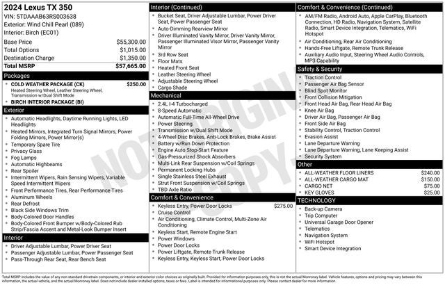 With Some Available Options Like Birch Interior Package, Cold Weather Package (Leather Heated Steering Wheel w/Paddles and Wiper & Window Deicer), 12 Speakers, 20 Wheels, 3rd row seats: split-bench, 4-Wheel Disc Brakes, ABS brakes, Air Conditioning, All-Weather Cargo Mat, All-Weather Floor Liners, Alloy wheels, AM/FM radio, Auto High-beam Headlights, Auto tilt-away steering wheel, Auto-dimming door mirrors, Auto-dimming Rear-View mirror, Automatic temperature control, Brake assist, Bumpers: body-color, Cargo Net, Delay-off headlights, Digital Key, Driver door bin, Driver vanity mirror, Dual front impact airbags, Dual front side impact airbags, Electronic Stability Control, Emergency communication system: Safety Connect (10-year trial), Exterior Parking Camera Rear, Four wheel independent suspension, Front anti-roll bar, Front Bucket Seats, Front Center Armrest, Front dual zone A/C, Front fog lights, Front reading lights, Fully automatic headlights, Garage door transmitter: HomeLink, Heated door mirrors, Heated Front Seats, Heated front seats, Illuminated entry, Key Gloves, Knee airbag, Leather Shift Knob, Leather steering wheel, Low tire pressure warning, Navigation system: Drive Connect Cloud Navigation (subscription required), NuLuxe Pattern Perforated Seat Trim, Occupant sensing airbag, Outside temperature display, Overhead airbag, Panic alarm, Passenger door bin, Passenger vanity mirror, Power door mirrors, Power driver seat, Power Liftgate, Power passenger seat, Power steering, Power windows, Radio data system, Radio: Lexus Interface, Rain sensing wipers, Rear air conditioning, Rear anti-roll bar, Rear Parking Sensors, Rear reading lights, Rear seat center armrest, Rear window defroster, Rear window wiper, Reclining 3rd row seat, Remote keyless entry, Security system, Speed control, Speed-sensing steering, Split folding rear seat, Spoiler, Steering wheel mounted audio controls, Tachometer, TBD Axle Ratio, Telescoping steering wheel, Tilt steering wheel, Traction control, Trip computer, Turn signal indicator mirrors, Variably intermittent wipers, and Wireless Apple CarPlay/Wireless Android Auto.
