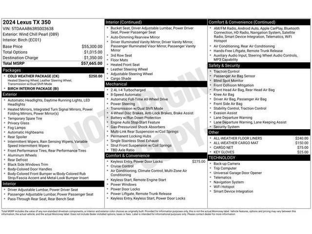 With Some Available Options Like Birch Interior Package, Cold Weather Package (Leather Heated Steering Wheel w/Paddles and Wiper & Window Deicer), 12 Speakers, 20 Wheels, 3rd row seats: split-bench, 4-Wheel Disc Brakes, ABS brakes, Air Conditioning, All-Weather Cargo Mat, All-Weather Floor Liners, Alloy wheels, AM/FM radio, Auto High-beam Headlights, Auto tilt-away steering wheel, Auto-dimming door mirrors, Auto-dimming Rear-View mirror, Automatic temperature control, Brake assist, Bumpers: body-color, Cargo Net, Delay-off headlights, Digital Key, Driver door bin, Driver vanity mirror, Dual front impact airbags, Dual front side impact airbags, Electronic Stability Control, Emergency communication system: Safety Connect (10-year trial), Exterior Parking Camera Rear, Four wheel independent suspension, Front anti-roll bar, Front Bucket Seats, Front Center Armrest, Front dual zone A/C, Front fog lights, Front reading lights, Fully automatic headlights, Garage door transmitter: HomeLink, Heated door mirrors, Heated Front Seats, Heated front seats, Illuminated entry, Key Gloves, Knee airbag, Leather Shift Knob, Leather steering wheel, Low tire pressure warning, Navigation system: Drive Connect Cloud Navigation (subscription required), NuLuxe Pattern Perforated Seat Trim, Occupant sensing airbag, Outside temperature display, Overhead airbag, Panic alarm, Passenger door bin, Passenger vanity mirror, Power door mirrors, Power driver seat, Power Liftgate, Power passenger seat, Power steering, Power windows, Radio data system, Radio: Lexus Interface, Rain sensing wipers, Rear air conditioning, Rear anti-roll bar, Rear Parking Sensors, Rear reading lights, Rear seat center armrest, Rear window defroster, Rear window wiper, Reclining 3rd row seat, Remote keyless entry, Security system, Speed control, Speed-sensing steering, Split folding rear seat, Spoiler, Steering wheel mounted audio controls, Tachometer, TBD Axle Ratio, Telescoping steering wheel, Tilt steering wheel, Traction control, Trip computer, Turn signal indicator mirrors, Variably intermittent wipers, and Wireless Apple CarPlay/Wireless Android Auto.