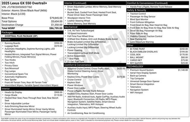 With a stunning Silver exterior and an array of advanced technologies, this 2025 Lexus GX 550 Overtrail+ is a must-see. Experience the ultimate in luxury, capability, and peace of mind. Visit our showroom today to take this exceptional vehicle for a test drive and discover how it can elevate your driving experience.