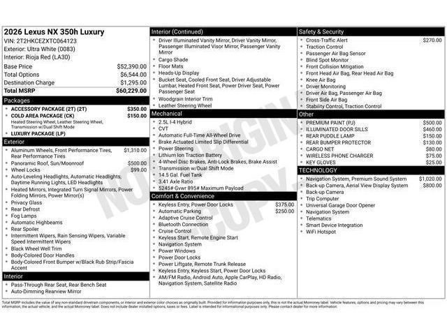 Boasting a stunning white exterior and a spacious, well-appointed cabin, this 2026 Lexus NX 350h Luxury is a true masterpiece of automotive engineering. Powered by a 2.5L I4 DOHC 16V engine with Continuously Variable (ECVT) and AWD, this SUV delivers an exceptional blend of performance and efficiency, with an impressive 41 MPG in the city and 37 MPG on the highway.
